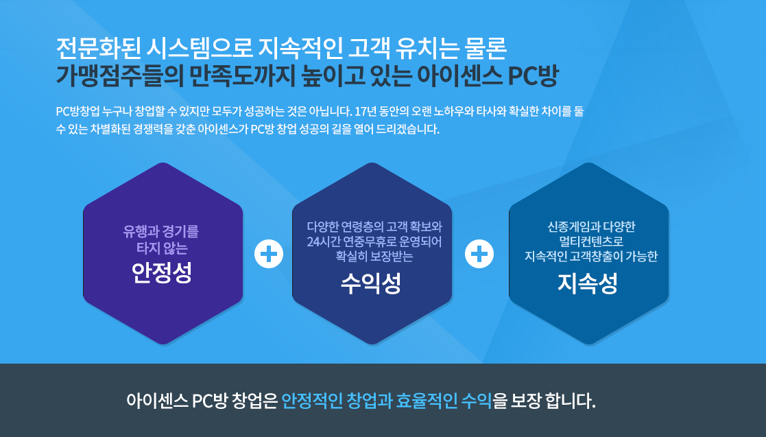 아이센스 PC방은 수익 전문가들의 고수익 창출 자신감에 근거하여 예비 창업자분들 께서 오픈 후 24개월까지 투자
